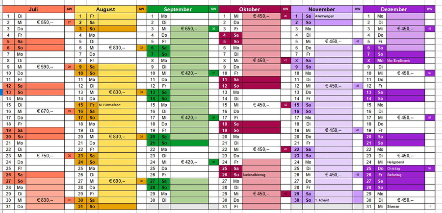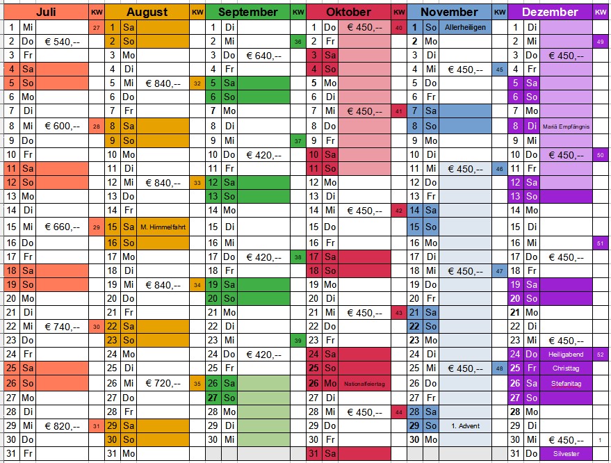 Ab der 2. Woche jeweils minus € 50,-- da die Endreinigung nur 1x pro Aufenthalt verrechnet wird.
