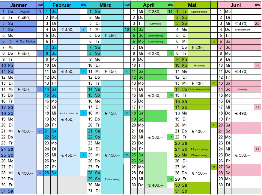 Preise sind für 2 erwachsene Personen, (Kinder bis 14 sind frei) für jede weitere erwachsene Person verrechne ich pro Woche € 10,-- zusätzlich